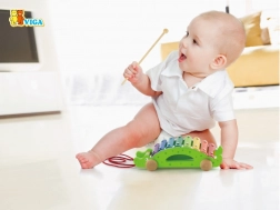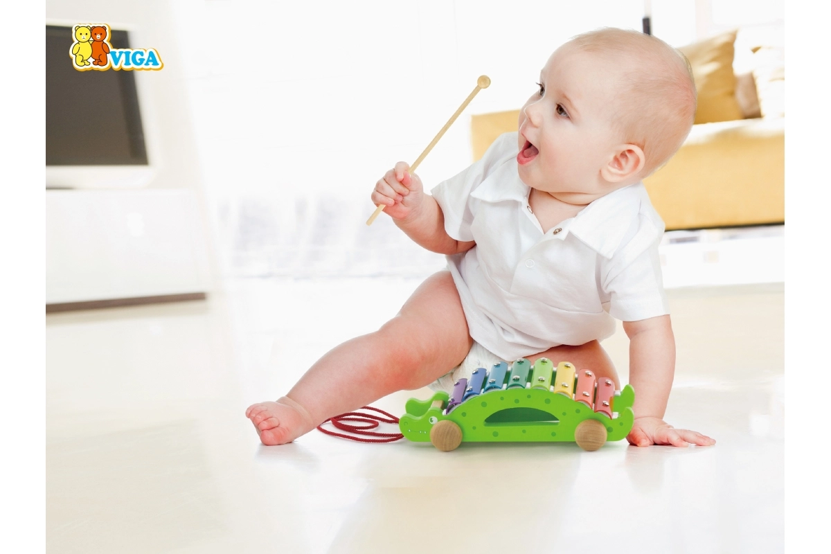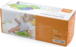 Clapele colorate ale xilofonului îi invită pe cei mici să descopere sunetele și să învețe ritmul, în timp ce crocodilul rulează pe roți după copil.