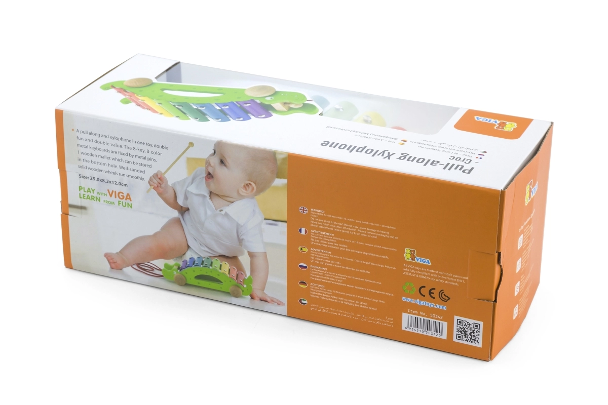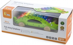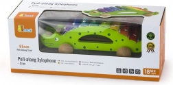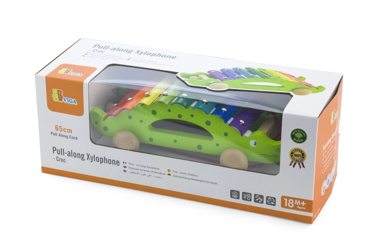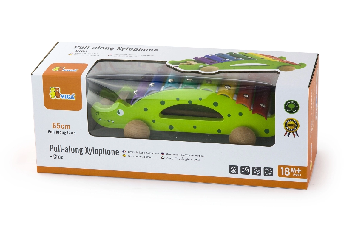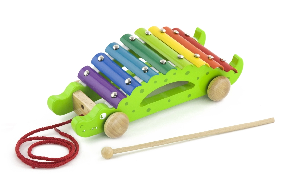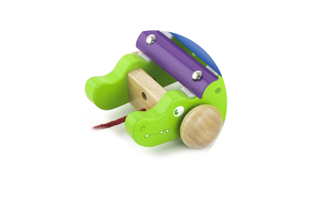 Xilofonul din lemn de tras în formă de crocodil este jucăria ideală pentru primele pași în muzică și pentru dezvoltarea motricității grosiere. Copiii îl pot trage după ei și, în același timp, pot crea melodii pe clapele metalice colorate. Construcția robustă din lemn și marginile netede asigură joacă în siguranță pentru cei mai mici, de la 18 luni.
