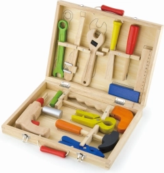 Practică set de unelte din lemn într-o valiză robustă pentru micii meșteri de la 3 ani. Conține 12 piese (bormașină, ciocan, fierăstrău, cheie, șurubelniță etc.) care dezvoltă motricitatea fină, creativitatea și jocul de-a meșterul. Dimensiuni compacte cca 31,5 × 24 × 6 cm, închizători metalice și mâner roșu pentru transport ușor.