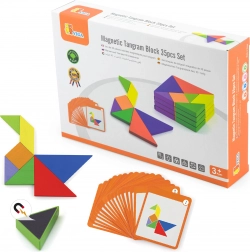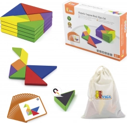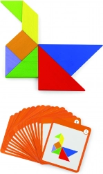 Acest tangram colorat din lemn este un instrument ideal atât pentru joaca acasă, cât și pentru educația preșcolară. Copiii creează imagini după cardurile incluse sau după propria imaginație, dezvoltând reprezentarea spațială, creativitatea și abilitatea de a rezolva probleme. Piesele atent finisate din lemn masiv sunt plăcute în mână și rezistente pentru utilizarea zilnică.