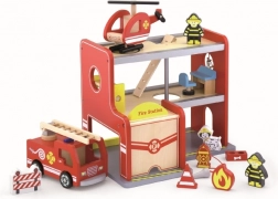 Această stație de pompieri din lemn, realizată cu atenție la detalii, le oferă copiilor un mediu autentic pentru misiuni de salvare. Datorită stației roșii pe mai multe niveluri, mașinii cu scară și platformei de aterizare pentru elicopter, copiii își pot crea cu ușurință propriile povești și își pot exersa coordonarea și gândirea logică.