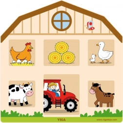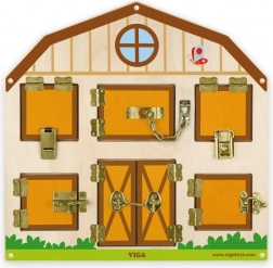 Această jucărie din lemn de calitate, în formă de căsuță, oferă mai multe ușițe cu tipuri diferite de încuietori – cârlige, zăvoare, lanțuri sau zăvoare glisante. La fiecare deschidere, copiii au parte de o surpriză sub forma unor animăluțe ilustrate, ceea ce stimulează curiozitatea, concentrarea și coordonarea mână–ochi.