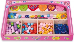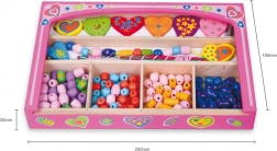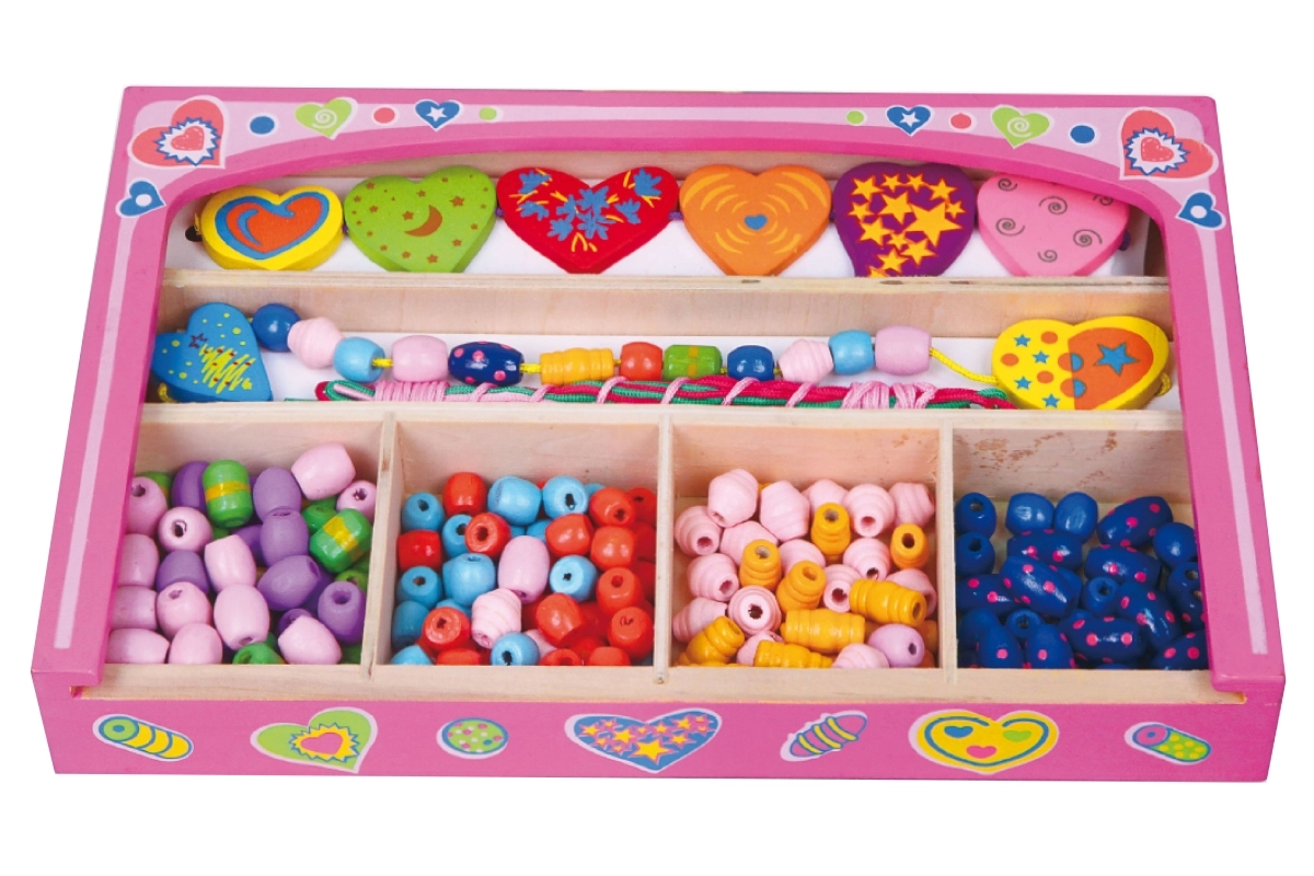 - Mărgele din lemn multicolore, forme (de ex. inimioare, steluțe), șnururi pentru înșirat, cutie din lemn cu compartimente