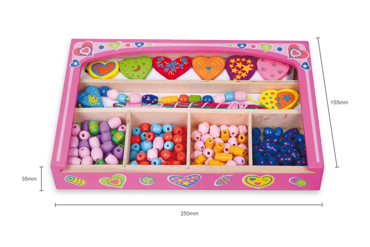 Mărgele de diferite dimensiuni și forme – inclusiv inimioare și steluțe – îi inspiră pe copii să creeze bijuterii unice și le dezvoltă imaginația.