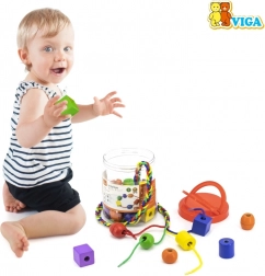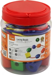 Acest set de mărgele din lemn, extra mari, este o jucărie ideală pentru dezvoltarea timpurie a copiilor. Datorită culorilor intense și formelor variate, copiii exersează sortarea, numărarea și creativitatea, în timp ce își întăresc priza și capacitatea de concentrare. Dimensiunea mărgelelor este adaptată mâinilor copiilor, astfel încât înșiratul este ușor și distractiv.