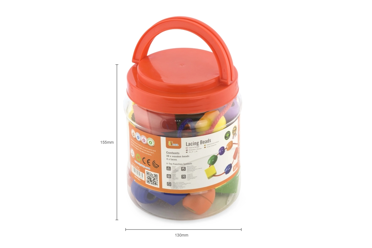 Mărgelele sunt depozitate într-o cutie din plastic rezistentă, cu capac, care facilitează transportul și păstrarea. Setul oferă învățare prin joc acasă și la grădiniță și este un excelent complement pentru activități Montessori.