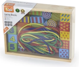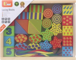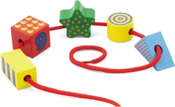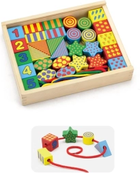 Acest set din lemn pentru înșirat oferă copiilor posibilități nelimitate de creație: înșirat ca mărgele, construit turnuri și căsuțe sau sortat după culori și forme. Piesele mari (aprox. 4 cm) se țin ușor în mână și sunt ideale pentru primele exerciții motorii.