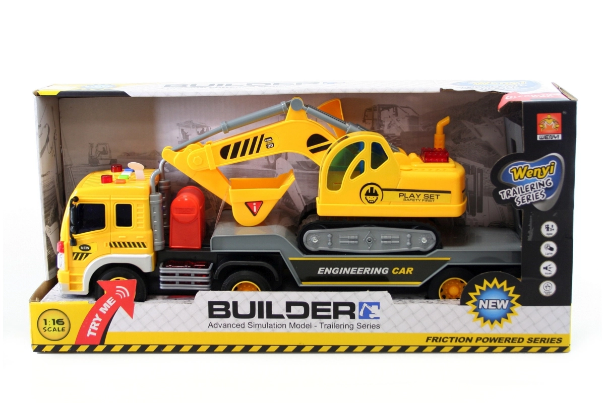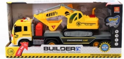 Descoperă setul de construcții plin de acțiune, care îi va încânta pe toți micii pasionați de tehnică. Capul tractor mare, cu platformă rabatabilă funcțională, transportă în siguranță excavatorul inclus către orice șantier pentru copii. La apăsarea celor patru butoane de pe capotă, capul tractor produce efecte sonore și semnale luminoase, pentru o experiență de joc realistă.