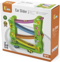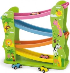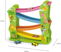 Acest tobogan din lemn frumos colorat este perfect pentru cei mici care vor să se joace și să-și dezvolte abilitățile. Include o rampă cu mai multe niveluri în culori diferite și permite mașinuțelor să se deplaseze ușor pe pistă.