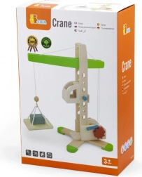Această macara din lemn cu troliu le oferă copiilor o experiență realistă de șantier. Brațul rotativ, înfășurarea manuală și sistemul cu scripete permit ridicarea și mutarea în siguranță a obiectelor mici. Lemnul natural, marginile netede și detaliile verzi subliniază designul atemporal și durabilitatea jucăriei.
