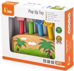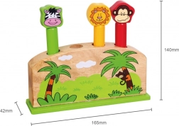 Acest joc pop-up din lemn cu animăluțe este o jucărie motrică ideală pentru început. Copiii introduc știfturile-animăluțe în orificii și, la apăsarea arcului, figurinele sar distractiv. Baza solidă din lemn, cu motiv de junglă, și animăluțele prietenoase invită la joacă repetată și dezvoltă răbdarea și concentrarea.