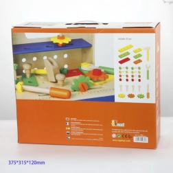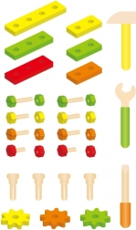 Toate componentele sunt adaptate mâinilor copiilor și realizate din lemn rezistent. Datorită gamei bogate de șuruburi, piulițe și plăcuțe, iau naștere posibilități infinite de combinații, care dezvoltă imaginația și răbdarea. Setul este grozav atât pentru joaca independentă, cât și pentru proiecte comune cu părinții.