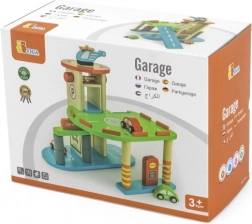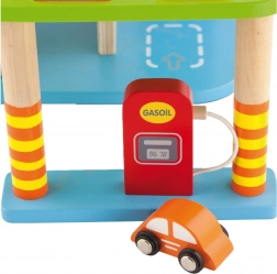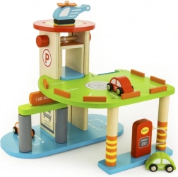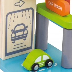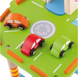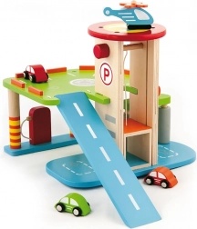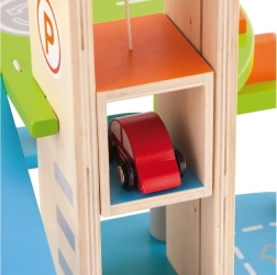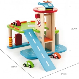 Această garajă din lemn de calitate oferă mai multe niveluri de parcare, o platformă de aterizare pentru elicopter și un lift practic pentru a muta ușor mașinuțele între etaje. Datorită designului bine gândit, cu piste, indicatoare și accesorii, copiii își exersează coordonarea mișcărilor și își dezvoltă imaginația.