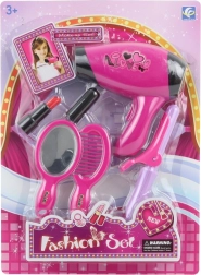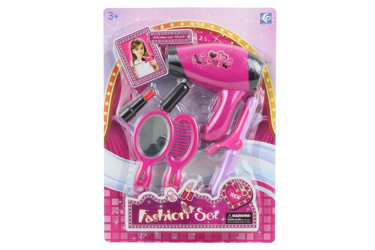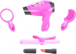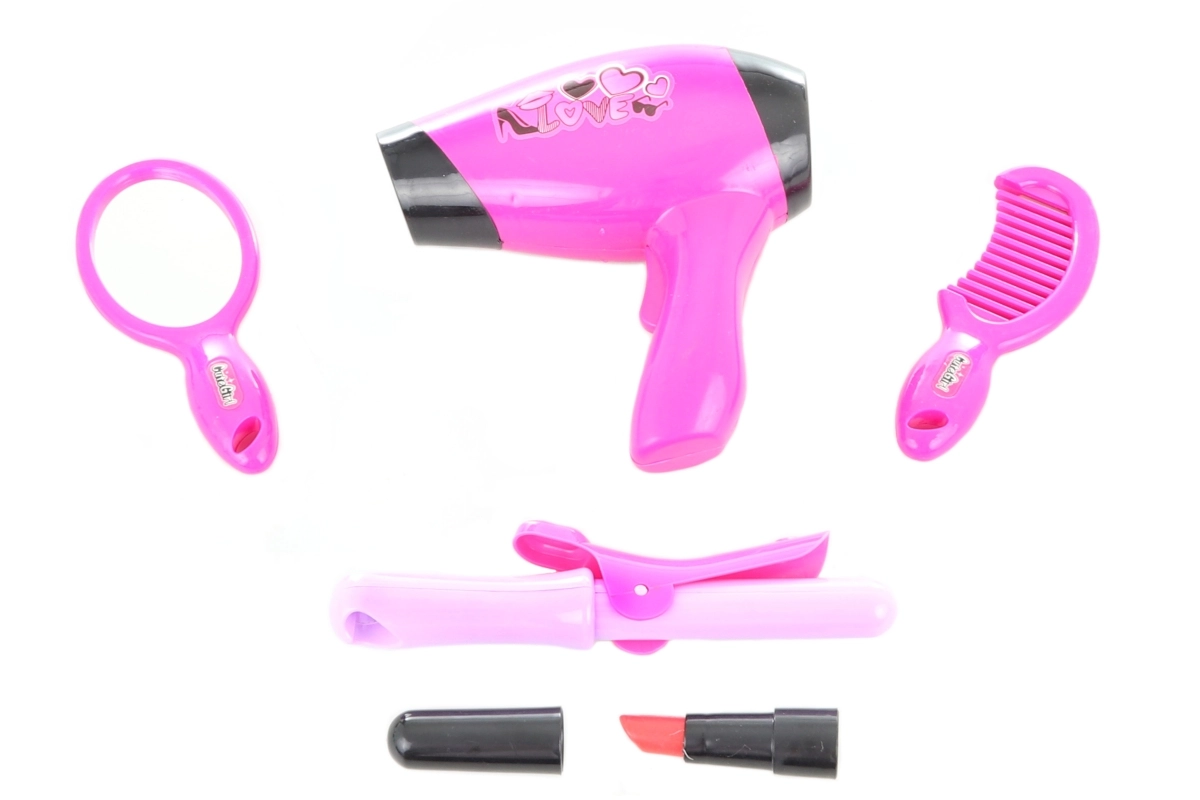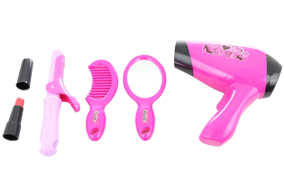 Acest set de frumusețe roz oferă copiilor tot ce au nevoie pentru primele experimente de coafor. Uscătorul alimentat de 1× baterie AA (nu este inclusă) este completat de un ondulator, pieptene, oglindă de mână și accesorii cosmetice – toate adaptate pentru mâinile mici ale copiilor.