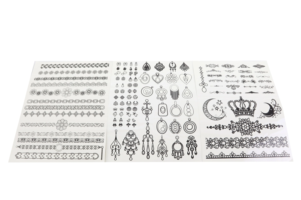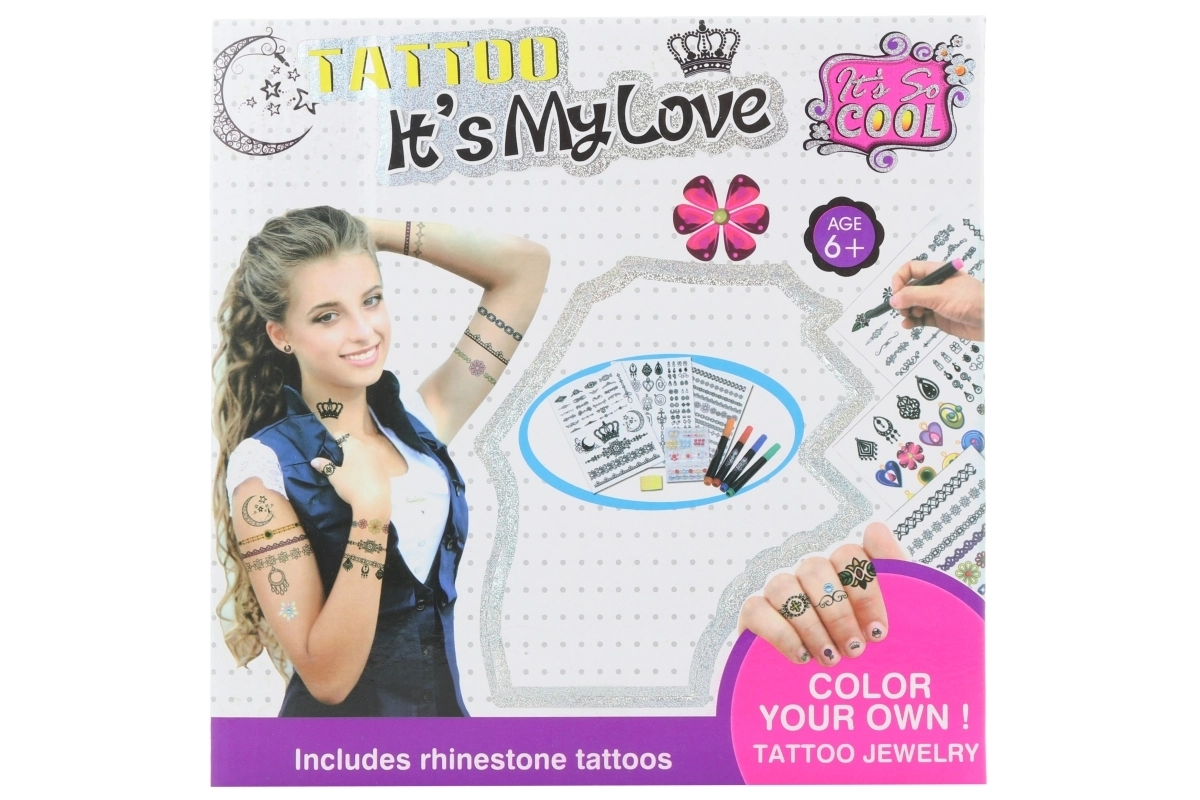Descoperă lumea tatuajelor temporare și a accesoriilor pe care le poți personaliza exact după dispoziția ta. Setul oferă o selecție bogată de motive – de la linii elegante și lanțuri până la coroane, luni și ornamente – și markere colorate pentru detalii. Pietricelele sclipitoare adaugă fiecărui motiv un efect lucios spectaculos.