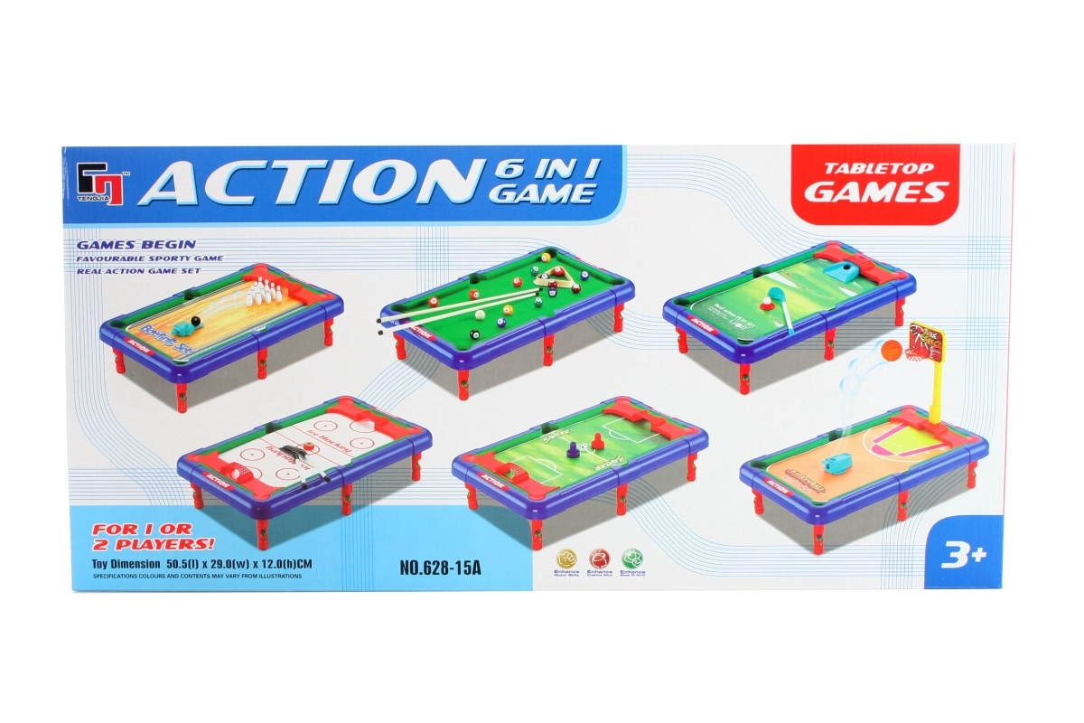 Acest set multifuncțional de sporturi de masă oferă șase jocuri populare într-un format practic. Dimensiunile compacte se potrivesc pe orice masă, oferind totuși suficient spațiu pentru un joc dinamic. Copiii pot încerca cu ușurință discipline diferite și își pot antrena precizia, viteza de reacție și lucrul în echipă.
