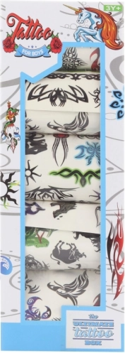 Set distractiv de tatuaje temporare pentru băieți, care include 5 coli diferite cu motive pentru joaca de zi cu zi. Aplicare ușoară și utilizare sigură de la 3 ani. Ambalaj compact, dimensiuni cca 8,5 × 24 × 4 cm, încape în rucsac sau într-un pachet cadou.