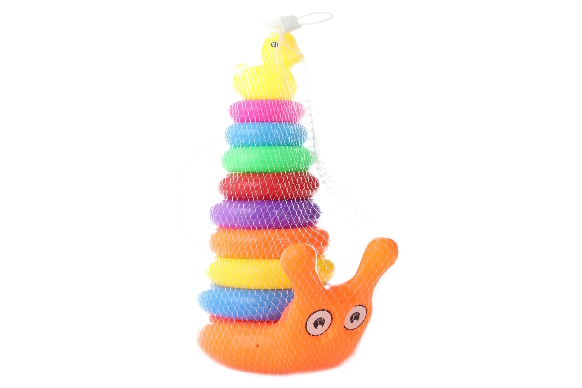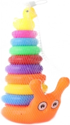 Stâlpul drăguț cu inele în formă de melc va încânta orice copil mic. Prin înșirarea treptată a inelelor, copiii își exersează răbdarea, gândirea logică și îndemânarea. Ultima piesă este o rățușcă din plastic, care oferă jocului un obiectiv distractiv și motivant.