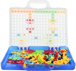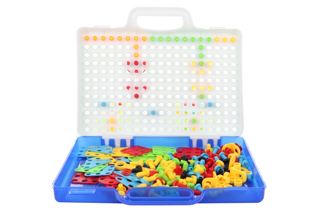 Totul este depozitat într-o geantă portabilă al cărei capac funcționează ca pegboard, astfel încât setul se transportă și se strânge cu ușurință. O unealtă excelentă pentru dezvoltarea motricității, coordonării mână–ochi, creativității și răbdării.
