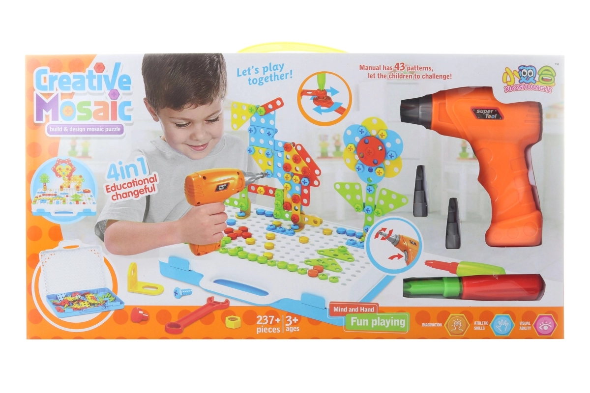 Creativul set de construcție cu șuruburi și bormașină oferă copiilor de la 3 ani ore de distracție și învățare. În geanta practică găsești 237 de piese, bormașină pentru copii, șurubelniță și instrucțiuni. Copiii își dezvoltă motorica fină, creativitatea și gândirea logică construind modele colorate și creații 3D pe plăcuța perforată.