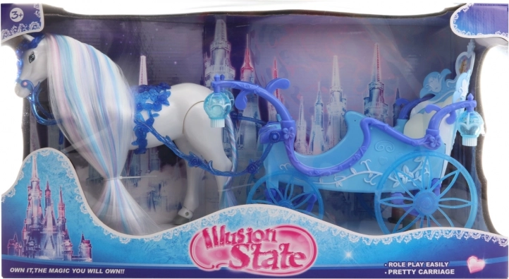 Căluț cu trăsură albastră. După introducerea bateriilor, calul merge, cântă și felinarele de pe trăsură luminează. Alimentare cu 2 baterii AA (nu sunt incluse în pachet). Dimensiuni ambalaj aprox. 56 x 30 x 19 cm. Vârsta 3+