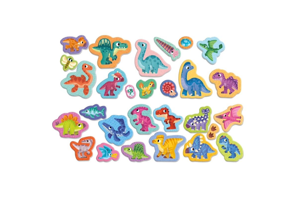 În set găsești 28 de magneți detaliați cu dinozauri îndrăgiți. Datorită grosimii de 4 mm, copiii îi pot prinde, aranja și muta cu ușurință. Materialul din spumă este ușor și plăcut la atingere, potrivit pentru joaca zilnică acasă și la grădiniță.