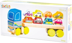 Cubika prezintă un camion de lemn unic cu mașinuțe, care îi va încânta pe copii cu culorile și designul său. Puzzle-ul conține 12 piese și permite transportul a 8 mașinuțe miniaturale. Lungimea camionului este de 32 cm, iar mașinuțele măsoară aproximativ 5 cm fiecare. Jucăria ajută la dezvoltarea: