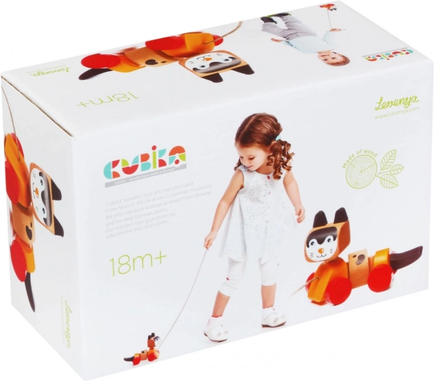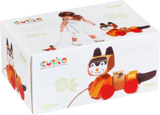 Jucăria de tras din lemn, proiectată în formă de pisicuță veselă, este ideală pentru divertisment și dezvoltarea abilităților motorii ale copiilor. Jucăria este echipată cu un trunchi flexibil și roți, ceea ce permite mișcări line și distractive la tragerea de șnur. Designul colorat atrage atenția copiilor și îi încurajează la joc activ.