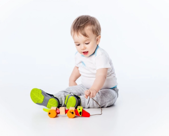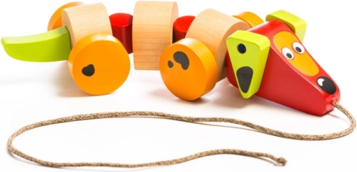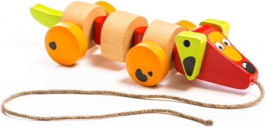 Datorită roților și sforii, jucăria este ușor de manevrat și copiii o pot trage cu ei oriunde merg.