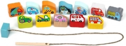 Setul de Cubika vehicule de transport din lemn de înșirat include 12 piese din lemn cu diverse motive de transport și o sfoară lungă de 45 cm cu un cârlig din lemn. Copiii își pot exersa memoria și îndemânarea folosind cele 8 modele incluse, în timp ce se distrează cu un joc educativ.