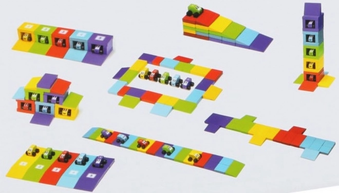 Cinci mașinuțe colorate și un set de cuburi transformă fiecare zi în curse captivante – de la start, prin boxe și până în garaj.