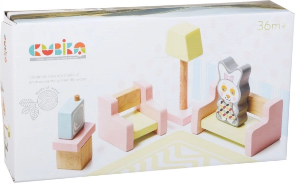 Descoperiți magia jucăriilor Cubika cu camera de living pentru păpuși, care este fabricată din lemn cultivat ecologic cu prelucrare precisă și design modern. Acest set conține 9 piese, inclusiv o canapea din lemn, fotoliu și accesorii magnetice.