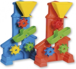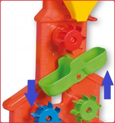 Această moară rezistentă este un însoțitor grozav pentru nisipar și pentru joaca la apă. Copiii pot turna nisip sau apă în pâlnia largă cu reglaj și pot observa cum cele trei roți colorate prind viață și se rotesc. Canela de distribuire ajută la direcționarea fluxului și stimulează experimentarea.