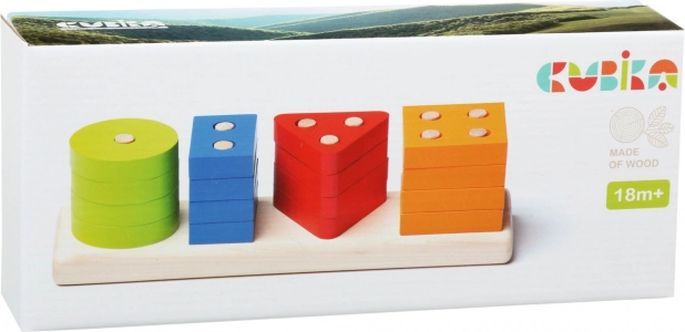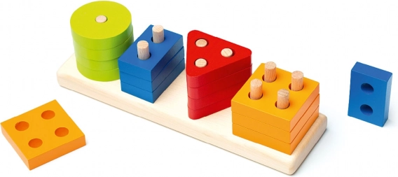 Acest puzzle din lemn de înaltă calitate oferă 16 forme geometrice colorate, care se înșiră pe știfturile bazei dreptunghiulare. Copiii, în timpul jocului, învață să recunoască culorile și formele, experimentează combinații diferite și își antrenează în mod natural coordonarea și răbdarea.