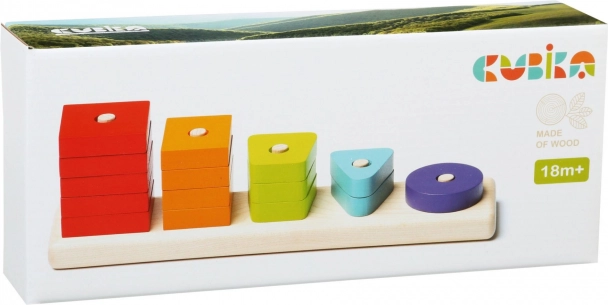 Puzzle-ul din lemn CUBIKA oferă o modalitate distractivă de a-i familiariza pe cei mici cu formele și culorile. Pe o bază pătrată robustă, prevăzută cu țăruși, copiii așază 15 piese colorate perforate – cercuri, triunghiuri, pătrate și alte forme geometrice simple – exersând în mod natural coordonarea mână–ochi și concentrarea.