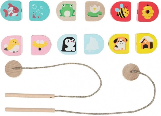 - 12 piese din lemn care formează 6 perechi tematice (animal + mediul său)