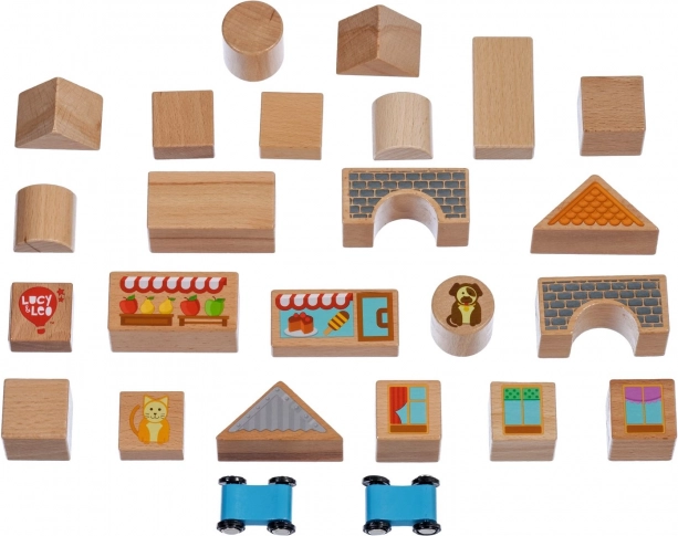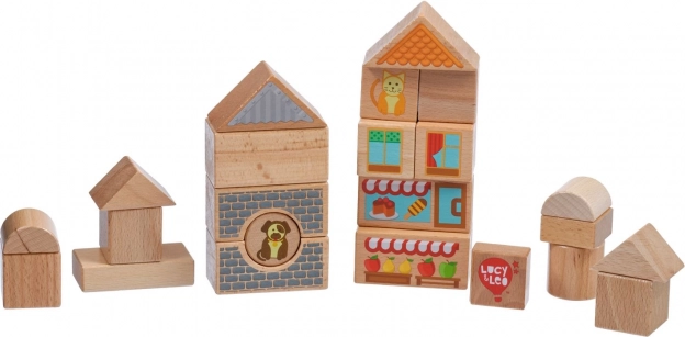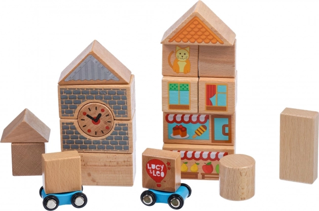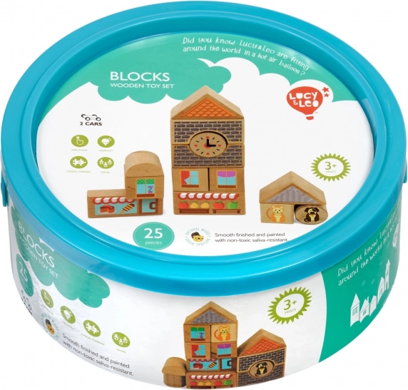 Descoperiți farmecul construcțiilor creative cu setul din lemn Lucy & Leo oraș. Setul conține 25 de piese din lemn de calitate, inclusiv 2 mașinuțe pe roți, în diverse forme și culori pentru a construi căsuțe și străduțe. Elementele ilustrate precum ferestre, acoperișuri și vitrine de magazine stimulează imaginația și jocul tematic. Jucăria sprijină motricitatea fină, gândirea logică și creativitatea, iar după joacă o puteți depozita ușor în cutia rotundă practică, cu capac și mâner.