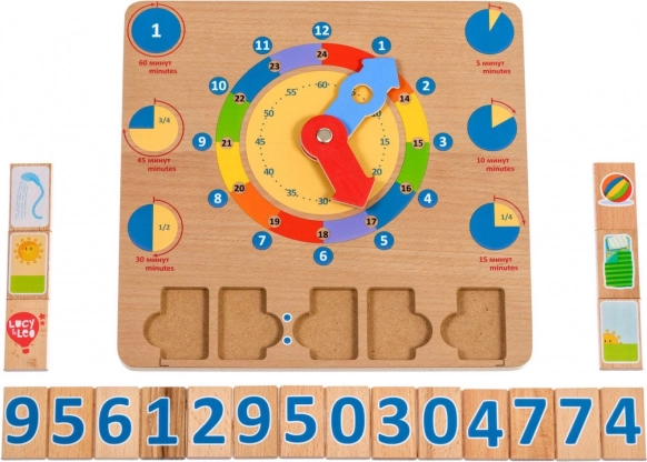 Tabla de joc din lemn Învățăm ceasul este un excelent material didactic ce susține învățarea naturală prin joc. Acele mari, colorate, și segmentele temporale clar delimitate le permit copiilor să înțeleagă mai ușor orele, minutele și activitățile zilnice la momente concrete.