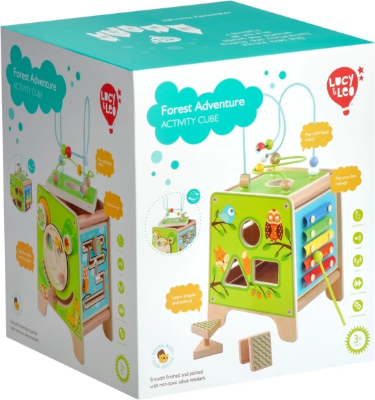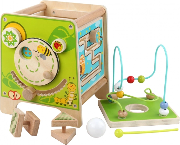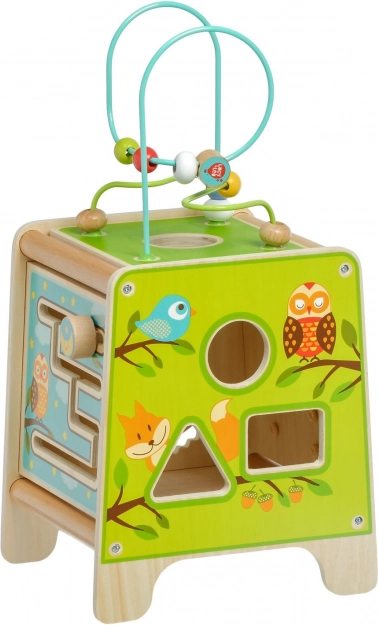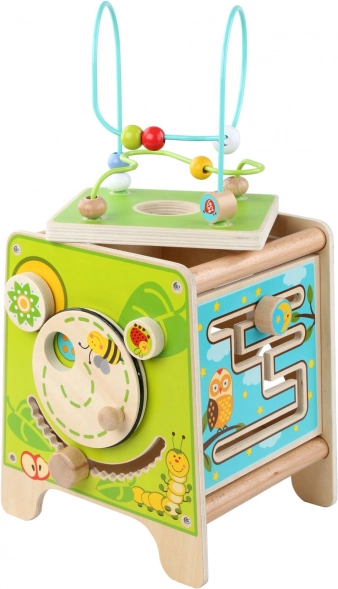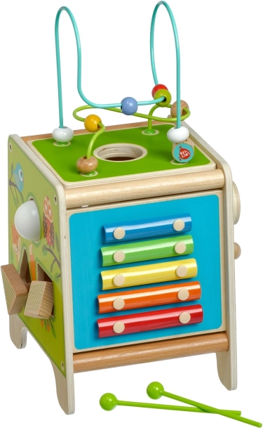 Acest cub activ colorat din lemn aduce copiilor ore de joacă cu sens. Labirintul cu mărgele de sus poate fi scos și întors în interiorul cubului pentru depozitare ușoară. Pe laturile cubului, copiii descoperă xilofon cu bețișoare, sortator cu forme geometrice rotative din două piese, labirint motric, rotiță rotativă, elemente pivotante și un joc distractiv de mutare a unui știft pe o șină.