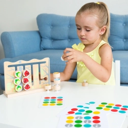 Sunt incluse 6 carduri față-verso cu modele colorate. Copiii poziționează butonașele conform acestora și își dezvoltă raționamentul logic.