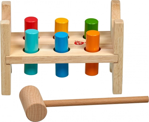 Cei șase țăruși colorați și ciocănelul din lemn îi învață pe copii priza precisă, forța loviturii și coordonarea mână–ochi.