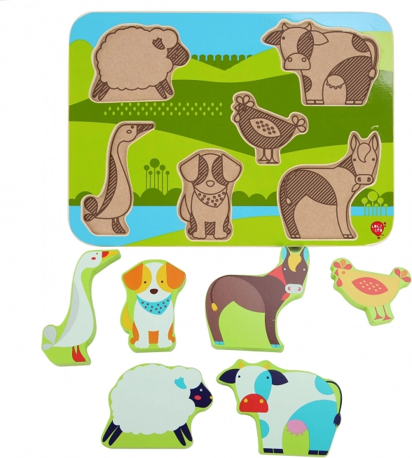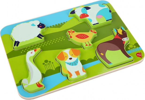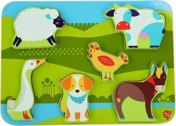 Puzzle-ul din lemn cu tema fermă îi va încânta pe fete și băieți prin culorile vii și suprafața plăcută, netedă. Fiecare dintre cele 7 animale are forma sa exactă, iar copilul o poate introduce cu ușurință în decupajul corespunzător. Datorită dimensiunii și grosimii, piesele sunt ușor de apucat și sunt sigure pentru joc independent.