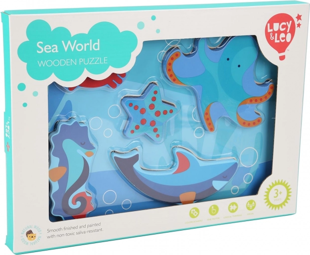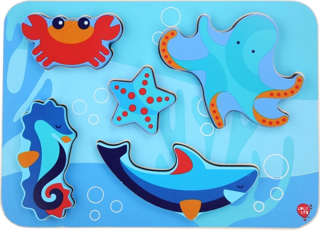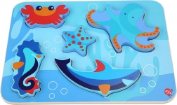 Puzzle-ul din lemn pentru copii cu tematică de viețuitoare marine este conceput pentru o învățare distractivă. Cele șase piese colorate – de exemplu caracatiță, stea de mare sau căluț de mare – se potrivesc perfect în formele frezate de pe placa robustă cu motiv oceanic. Piesele sunt suficient de mari pentru a fi ușor de ținut și, datorită grosimii lor, pot sta singure în picioare.