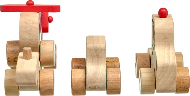 Acest puzzle din lemn pentru cei mici îmbină distracția cu învățarea. Copiii pot conduce separat camionul, mașinuța și elicopterul, apoi le pot încărca pe platformă și porni „la drum”. Accentele colorate și formele simple ajută la dezvoltarea percepției vizuale, în timp ce manipularea pieselor antrenează prinderea și îndemânarea.