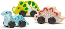 Setul conține trei dinozauri din lemn cu roți pentru o mișcare ușoară, ideali pentru cei mici.