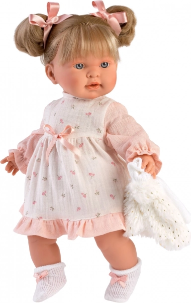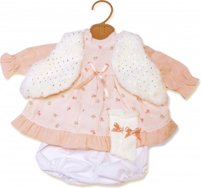 Ținută stilată în 4 piese pentru păpușă de 42 cm de la marca LLORENS încântă cu rochița roz delicată, vestița pufoasă și chiloței, împreună cu un umeraș. Fabricat în Spania, ideal atât pentru joaca de zi cu zi, cât și pentru momente festive. Potrivit de la 3 ani.