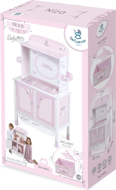 Descoperiți colecția Niza, într-un roz delicat, cu acest șifonier frumos și practic pentru păpuși, care îmbină spațiul de depozitare și centrul de înfășat. Partea inferioară oferă o bară pentru umerașe și un sertar pentru haine, iar partea superioară servește drept masă de înfășat, cu imprimeu în designul colecției.