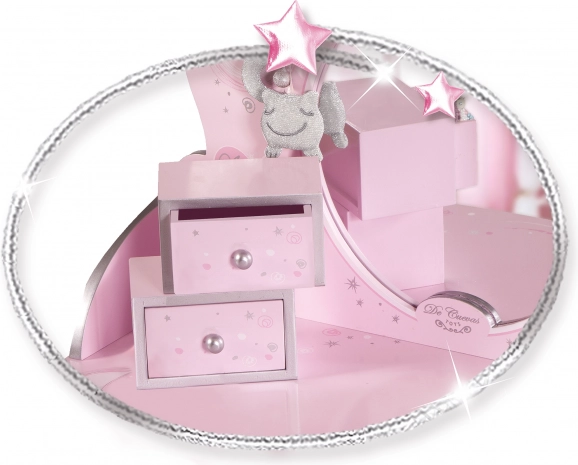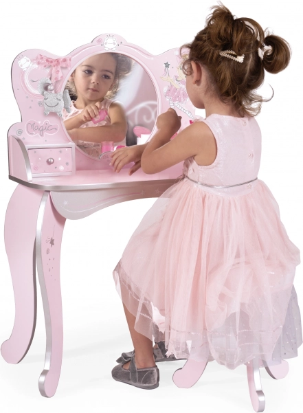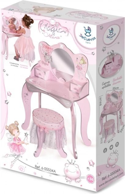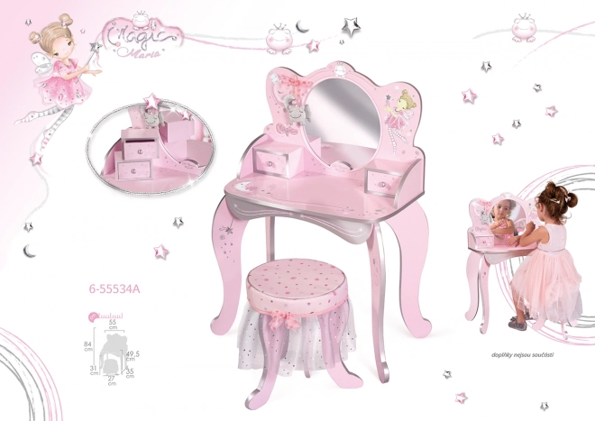 Această măsuță de toaletă magică pentru copii Magic Maria, în variantă roz cu elemente decorative, oferă un loc de joacă fermecat pentru micile cochete pentru a se juca și a depozita obiecte mici.