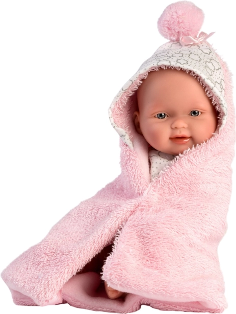 Acest costum cu două piese este special conceput pentru păpușa bebeluș Nou Născut cu o dimensiune de 26 cm. Include o pătură reversibilă cu glugă, care protejează păpușa și îi oferă aspectul unui bebeluș adevărat.