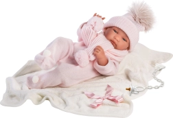 Set de hăinuțe stilat, format din 3 piese, pentru păpușa bebeluș New Born marca Llorens, mărime 43-44 cm, include o păturică decorativă din fleece cu fundiță. Fabricat în Spania și oferă un aspect perfect pentru păpușile tale.